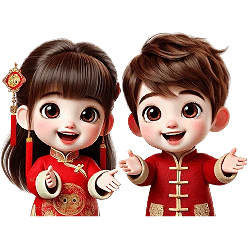 Dois personagens de anime infantil, um menino e uma menina, vestidos com roupas vermelhas tradicionais chinesas com…