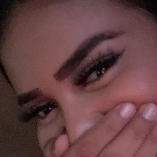 Rosto de mulher com a mão na boca, maquiagem pesada nos olhos, expressão de surpresa ou vergonha.
