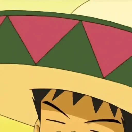 Personagem de anime com chapéu colorido, olhos fechados e expressão relaxada.