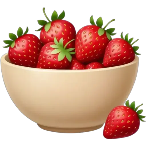 Uma tigela de morangos frescos e vermelhos com folhas verdes, com um morango caído ao lado.