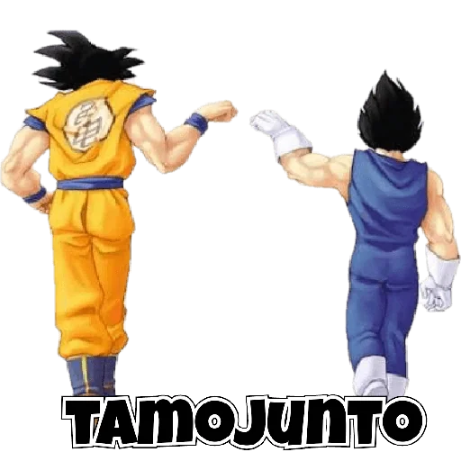 Dois personagens de Dragon Ball com as costas viradas, um de azul e outro de amarelo, com o texto 'TAMO JUNTO' embaixo.
