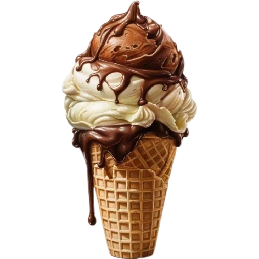 Um sorvete de casquinha com duas cores, coberto com chocolate derretido.