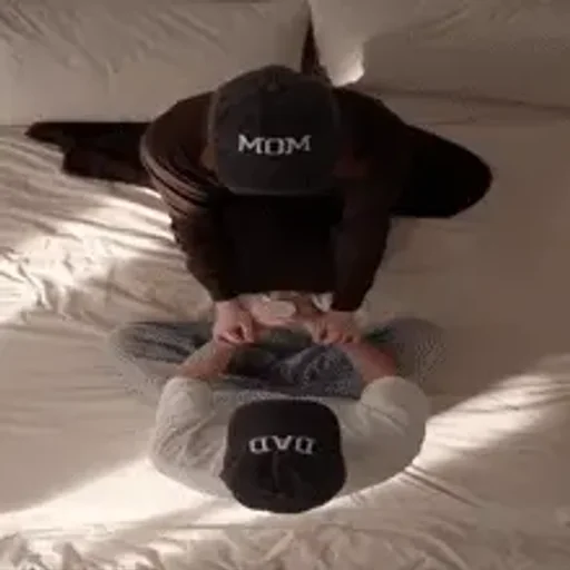 Um menino e uma menina deitadas em uma cama com lençóis brancos, ambos usando bonés com 'MOM' e 'DAD' escritos neles.