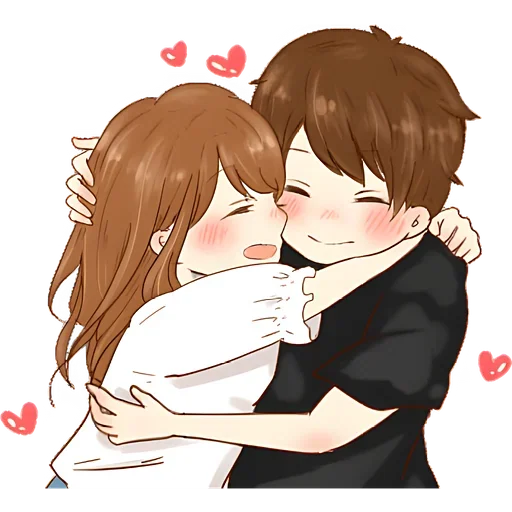 Um casal de anime, com o homem beijando a bochecha da mulher. Ela tem cabelo castanho longo e ele tem cabelo castanho curto, ambos com rosado nas bochechas.