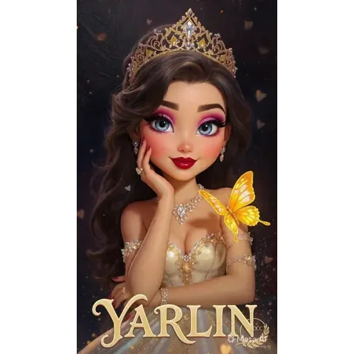 Uma princesa de olhos azuis e cabelo castanho, usando uma coroa dourada e um vestido dourado, com a mão no rosto e um fundo escuro com estrelas. O nome 'YARLIN' está escrito em letras douradas na parte inferior.