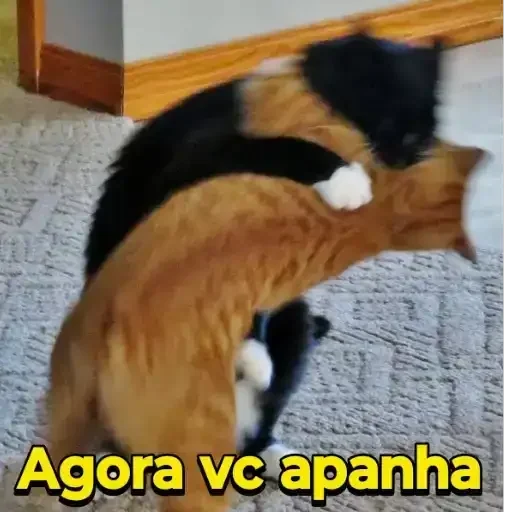 Dois gatos, um preto e um laranja, estão em uma posição engraçada no chão, como se estivessem brigando ou brincando. O texto 'Agora vc apanha' aparece em amarelo na parte inferior.