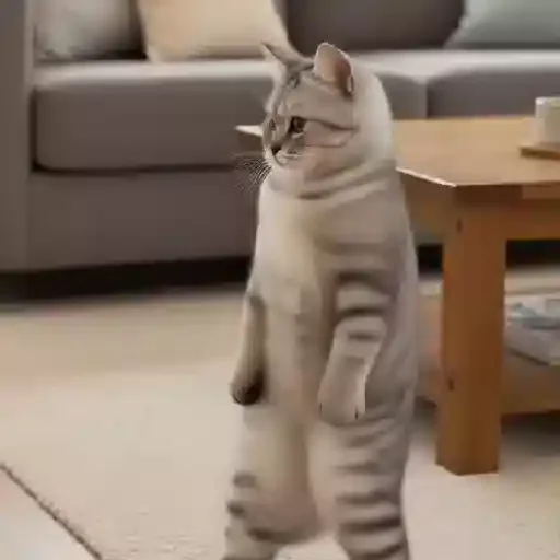 Gato cinza com listras pretas dançando em uma sala com sofá e mesa de madeira ao fundo. O gato tem a pata levantada.