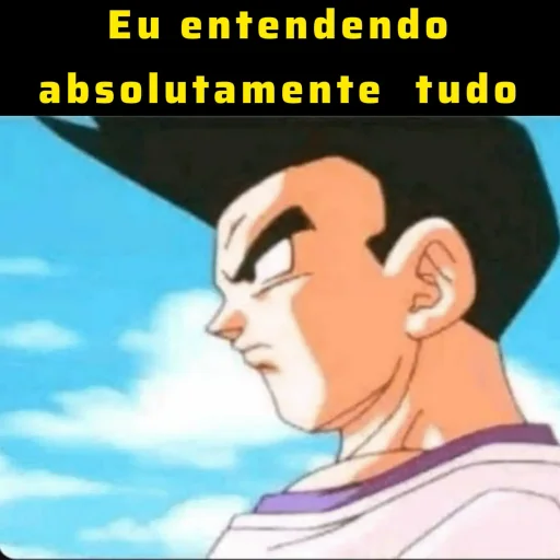 Um personagem de anime com cabelo preto e expressão séria, com o texto 'Eu entendendo absolutamente tudo' em amarelo sobre um fundo preto.
