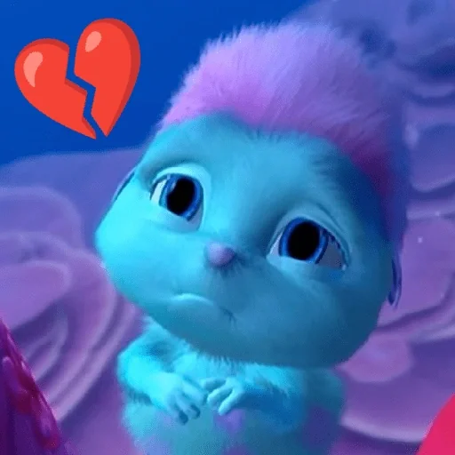 Um personagem de cor azul com cabelo rosa e um coração partido ao lado, com expressão triste.
