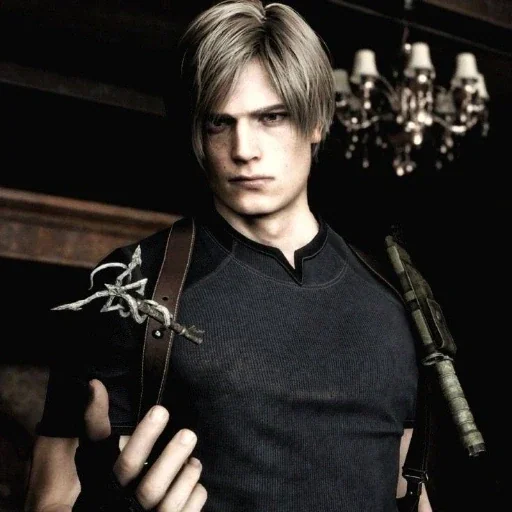 Personagem de jogo com cabelo loiro e camisa preta, segurando objeto com a mão esquerda, com uma alça escura sobre o ombro. Fundo escuro com lustre.