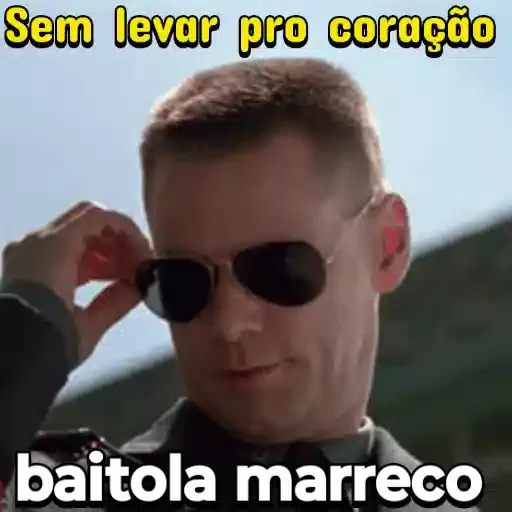 Imagem de um homem com óculos escuros e cabelo curto, com as frases 'Sem levar pro coração' e 'baitola marreco' sobrepostas.