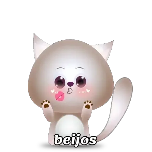 Gatinho fofinho com beijinhos, olhos grandes e rosados, com a palavra 'beijos' embaixo.
