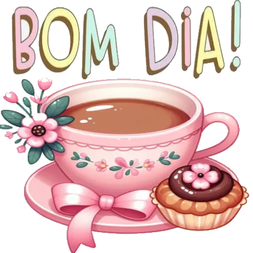 Uma xícara de chá rosa com flores e um bolo de chocolate ao lado, com a frase 'BOM DIA!' em letras coloridas.
