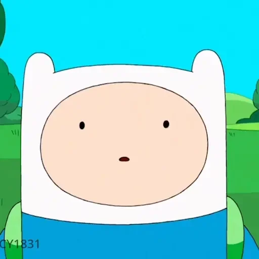 Rosto de Finn, personagem de Adventure Time, com expressão neutra e fundo verde. Ele está usando uma fantasia de lobo.