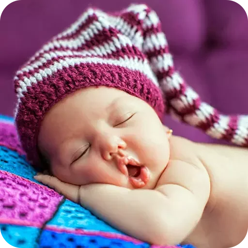 Um bebê recém-nascido deitado de lado, usando um gorro de crochê rosa e branco, com a mão sob a cabeça e a boca aberta, como se estivesse chorando ou fazendo careta.