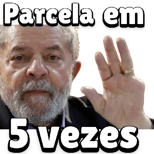 Um homem mais velho com bigode e barba grisalhos, usando um anel no dedo, faz um gesto com a mão direita como se estivesse explicando algo. Ele está com uma expressão facial séria. A imagem traz o texto "Parcela em 5 vezes"