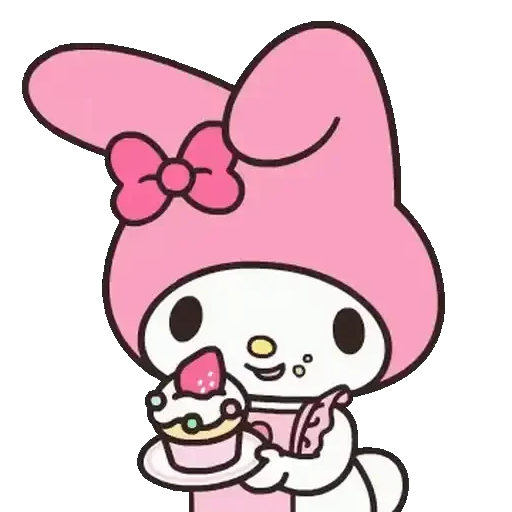 Um personagem de desenho animado fofinho, com orelhas de coelho rosa e um laço, segurando um bolo de aniversário com uma cereja.