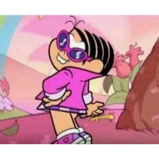 Menina de óculos cor-de-rosa dançando em cenário colorido com flores e montanhas ao fundo.