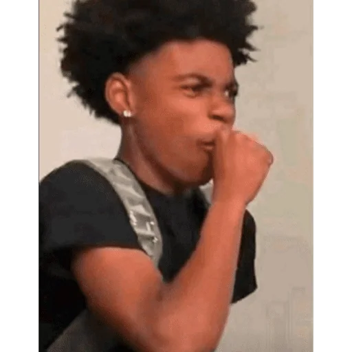 Um jovem negro com cabelo afro e uma expressão de surpresa ou choque, com a mão na boca.