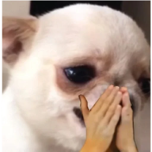 Um cachorro branco com as mãos de uma pessoa cobrindo seu focinho, parecendo envergonhado ou surpreso.