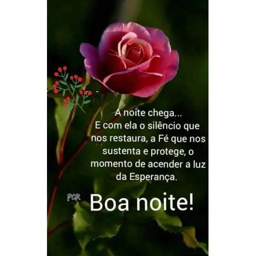 Uma rosa roxa com folhas verdes e pequenos botões vermelhos ao lado de uma citação em português que diz: 'A noite chega... E com ela o silêncio que nos restaura, a Fé que nos sustenta e protege, o momento de acender a luz da Esperança. Boa noite!'