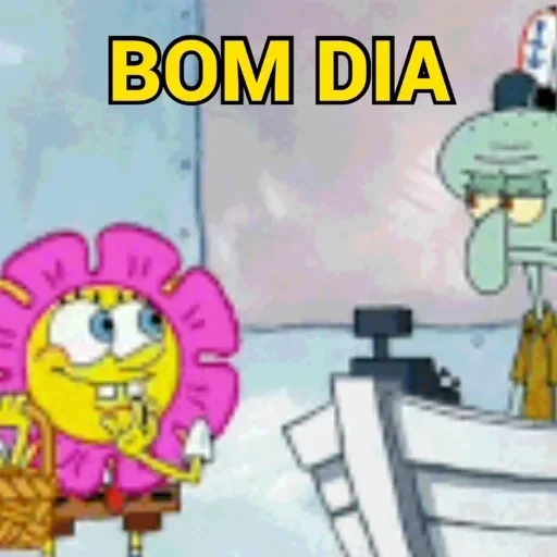 Personagem amarelo com flor rosa na cabeça e texto 'BOM DIA' em amarelo. Fundo azul e cinza.