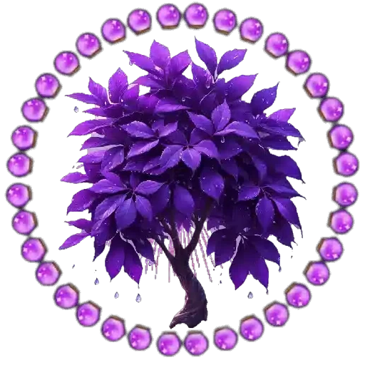 Uma árvore roxa com folhas abundantes no centro de um círculo de joias roxas.