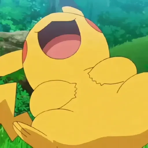 Pikachu deitado de costas com a boca aberta e expressão de surpresa ou choque, em um fundo verde.