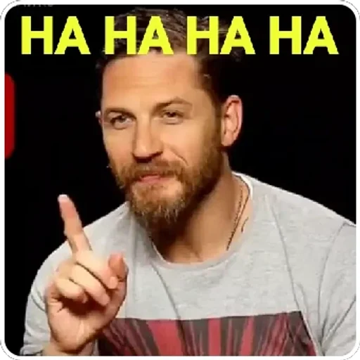 Homem com barba e cabelo curto, vestindo uma camiseta cinza com listras vermelhas, ri e aponta o dedo indicador enquanto a legenda 'HA HA HA HA' aparece em amarelo acima dele.