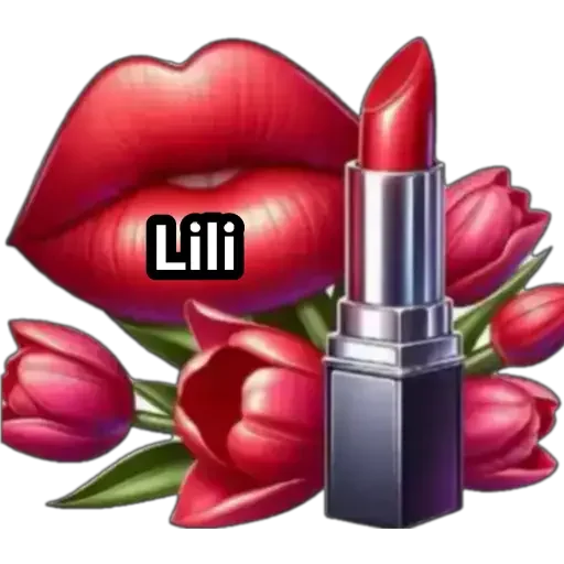Um batom vermelho brilhante ao lado de uma boca com lábios pintados de vermelho e tulipas vermelhas, com o nome 'Lili' sobreposto aos lábios.
