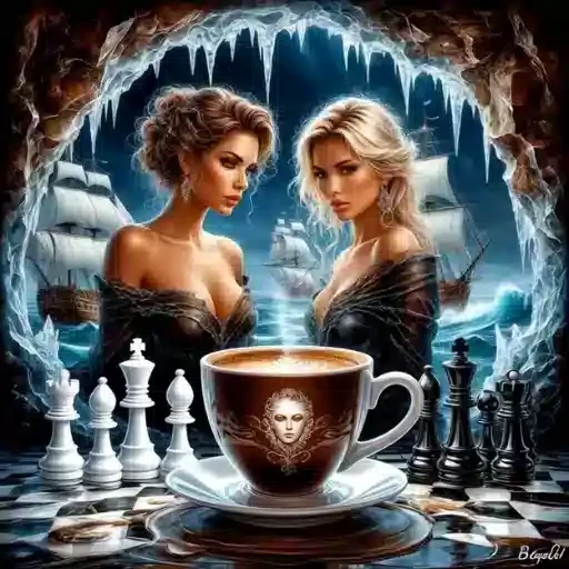 Duas mulheres de cabelos castanhos e loiros olham uma para a outra, com um fundo de xadrez e uma xícara de café com um rosto no centro.