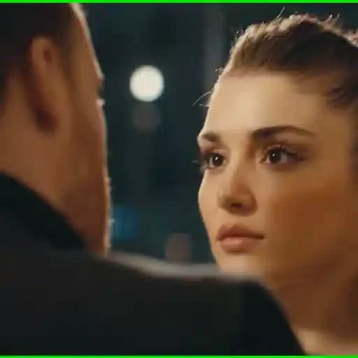 Uma mulher olha para um homem com uma expressão séria, ambos em um ambiente noturno com luzes ao fundo.
