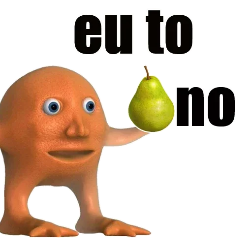Um personagem de cor laranja com olhos azuis e um sorriso, segurando uma pera verde, com o texto 'eu to no' em preto.