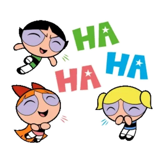 Três personagens de desenho animado com expressão de riso, olhos fechados e 'HA HA HA' colorido ao redor.
