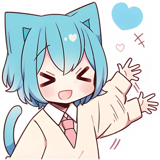 Uma menina de anime com cabelo azul e orelhas de gato sorri com um coração no pensamento e um gesto de alegria.