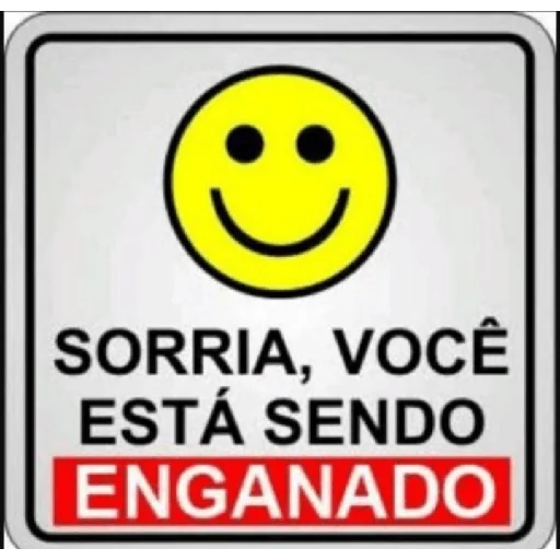 Um sorriso amarelo com olhos pretos e um texto que diz 'Sorria, você está sendo enganado'.
