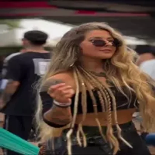 Mulher com dreadlocks loiros e óculos de sol, vestindo um top preto e calça, com pulseiras e tatuagem no braço, em um ambiente ao ar livre com pessoas ao fundo.