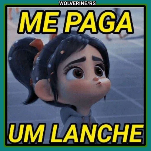 Personagem de desenho animado com expressão facial séria e cabelos pretos em um coque, pedindo 'ME PAGA UM LANCHE' em letras amarelas.