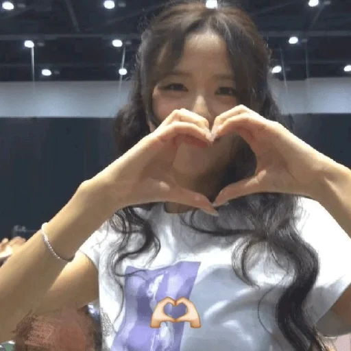 Uma jovem com cabelo castanho escuro fazendo um coração com as mãos na frente do rosto, usando uma camiseta branca com um logotipo roxo.