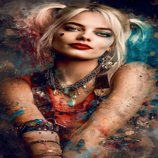Harley Quinn com penteados laterais, maquiagem colorida e correntes, em um fundo multicolorido.
