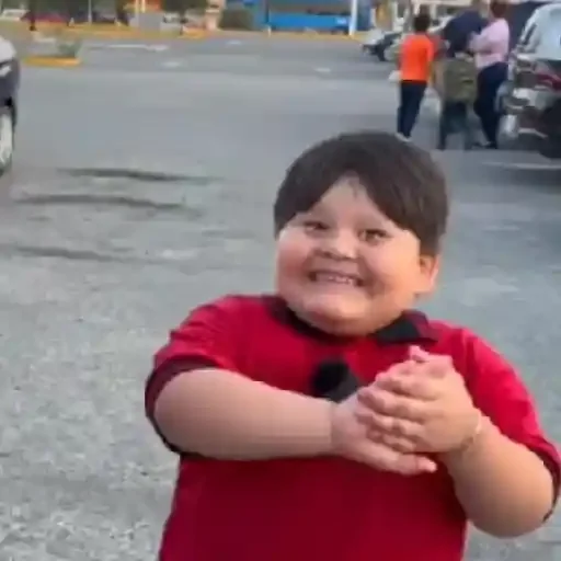 Menino com camisa vermelha e cabelo castanho fazendo um gesto com as mãos em um estacionamento.