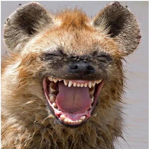 Um hiena com a boca aberta, mostrando os dentes, e os olhos semicerrados, com uma expressão engraçada.