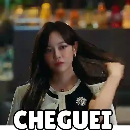 Uma jovem mulher com cabelo longo e escuro, vestindo uma blusa preta e branca, aparece com uma expressão facial séria enquanto toca seu cabelo. A palavra 'CHEGUEI' está escrita em letras grandes na parte inferior.