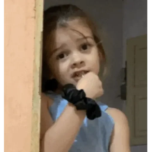 Menina com cabelo castanho e vestido azul escondendo-se atrás de uma porta, com um elástico preto no pulso, olhando para frente com a mão no queixo.