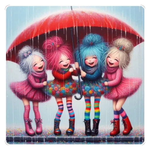 Quatro meninas de mãos dadas sob um guarda-chuva vermelho na chuva, vestidas com roupas coloridas e chapéus de flores.