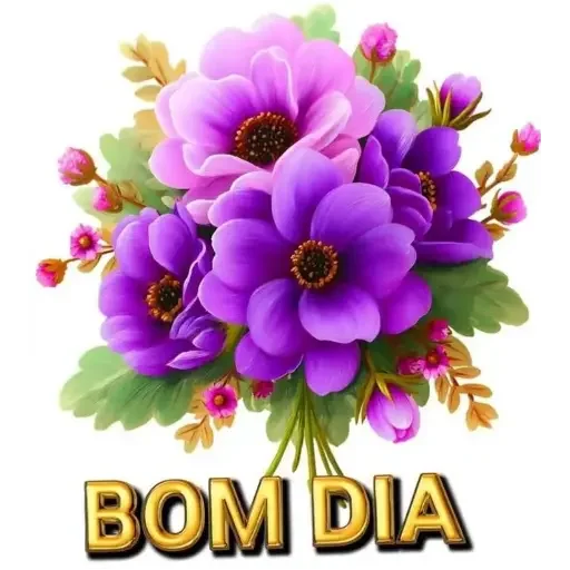 Um buquê de flores roxas e lilás com folhas verdes e pequenos botões rosa, com o texto 'BOM DIA' em letras douradas.