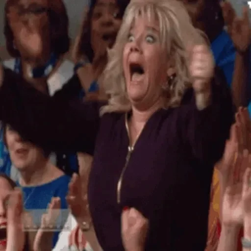 Mulher loira com expressão de surpresa ou choque, vestida de preto, com os braços levantados em meio a uma multidão que aplaude.
