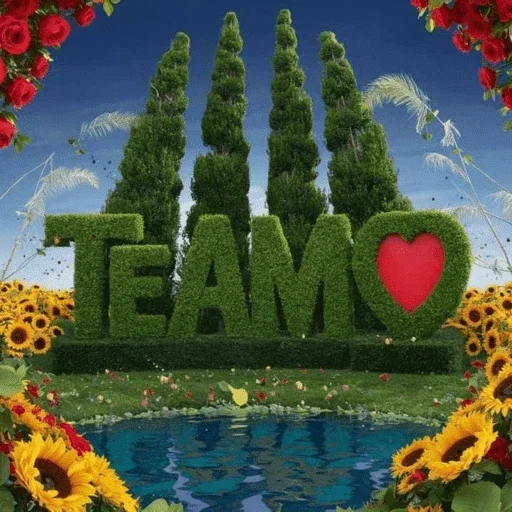 Um jardim com a palavra 'TEAMO' feita de grama, com um coração vermelho no 'O'. Flores de girassol e rosas vermelhas decoram a imagem.