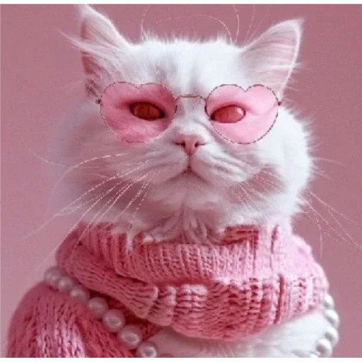 Gato branco usando óculos de sol cor-de-rosa e suéter de tricô rosa com botões brancos.