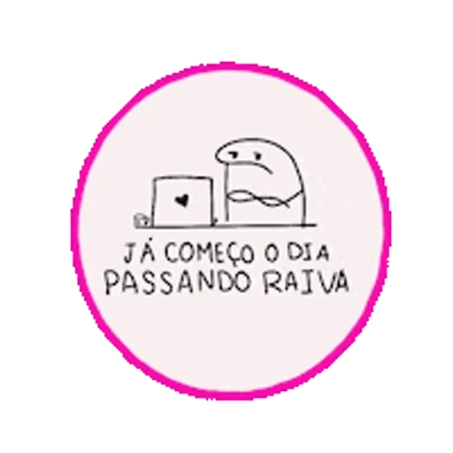 Um desenho de um personagem com expressão de raiva em frente a um computador com um coração na tela, com o texto 'JÁ COMEÇO O DIA PASSANDO RAIVA'